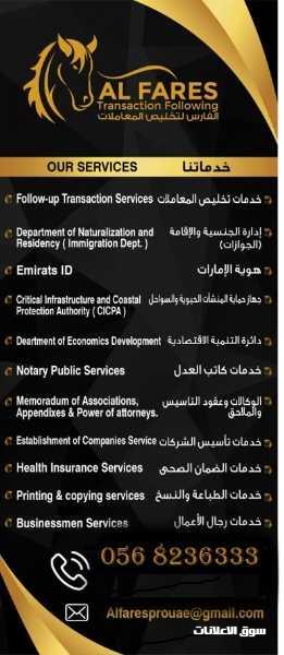 نحن جاهزون لاتمام جميع معاملاتك عن طريق مندوبين أكفاء في كافة الدوائر الحكومية تنمية اقتصادية جوازات عمل وعمال ضمان صحي غرفة التجارة والصناعة خدمات كاتب العدل وجميع ما يخص الشركات والمؤسسات من رخص في دائرة التنمية الاقتصادية أبوظبي ويوجد لدينا مكاتب للترخيص اذا كان لديك منشأة كبيرة أو صغيرة وليس لديك مندوب علاقات عامة سارع بالاتصال بنا يصلك مندوبنا في أي مكان لانهاء معاملاتك بأقصى سرعة موبايل واتساب 971568236333