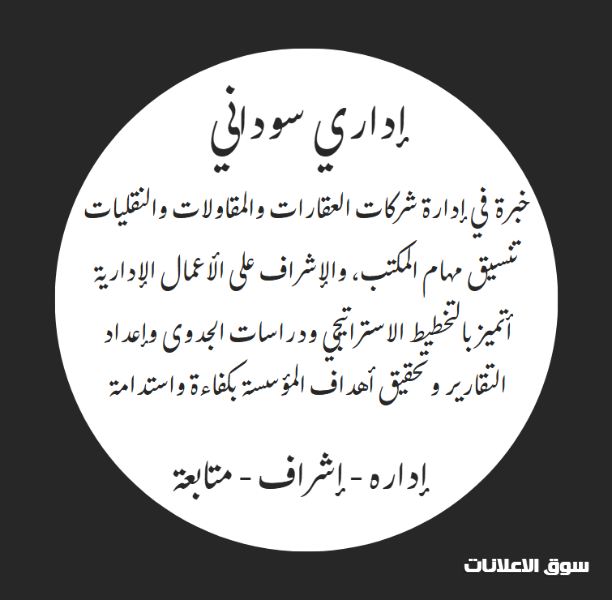I am a Sudanese administrator seeking an employment opportunity in the administrative and supervisory field I have experience in coordinating office tasks overseeing administrative operations managing official documents and processing government transactions I have managed real estate contracting and transportation companies and I excel in accuracy organization and the ability to work under pressure in addition to strategic planning preparing feasibility studies and achieving institutional goals with efficiency and sustainability For contact please call 0508610332
